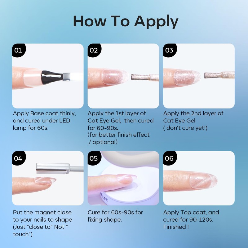 - [ Care for You ]: This D Cat Eye Nail Gel Polish may cause an allergic reaction upon skin contact in rare cases. Please do a patch test before using to check for any reaction. Note that this item is a U V LED gel and remains sticky after curing. It must be used with a base coat and top coat (not included, need to be purchased separately)