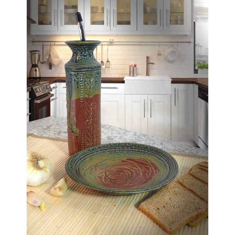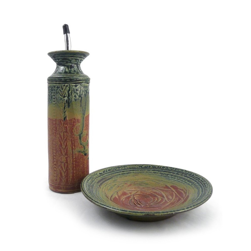 Modern Artisans American Made Stoneware Pottery Oil Cruet Bottle and Dipping Dish Set, Red Desert