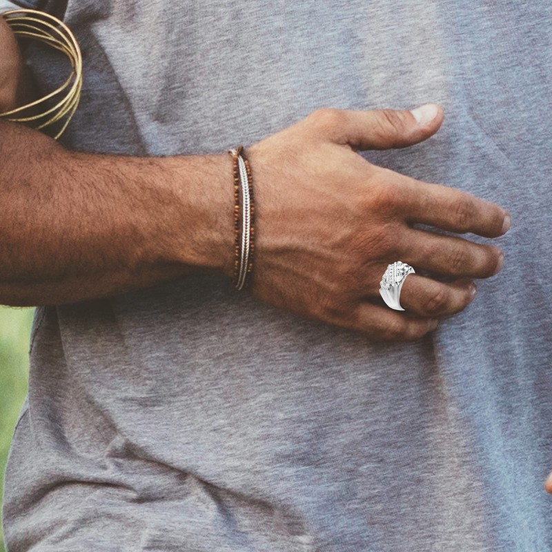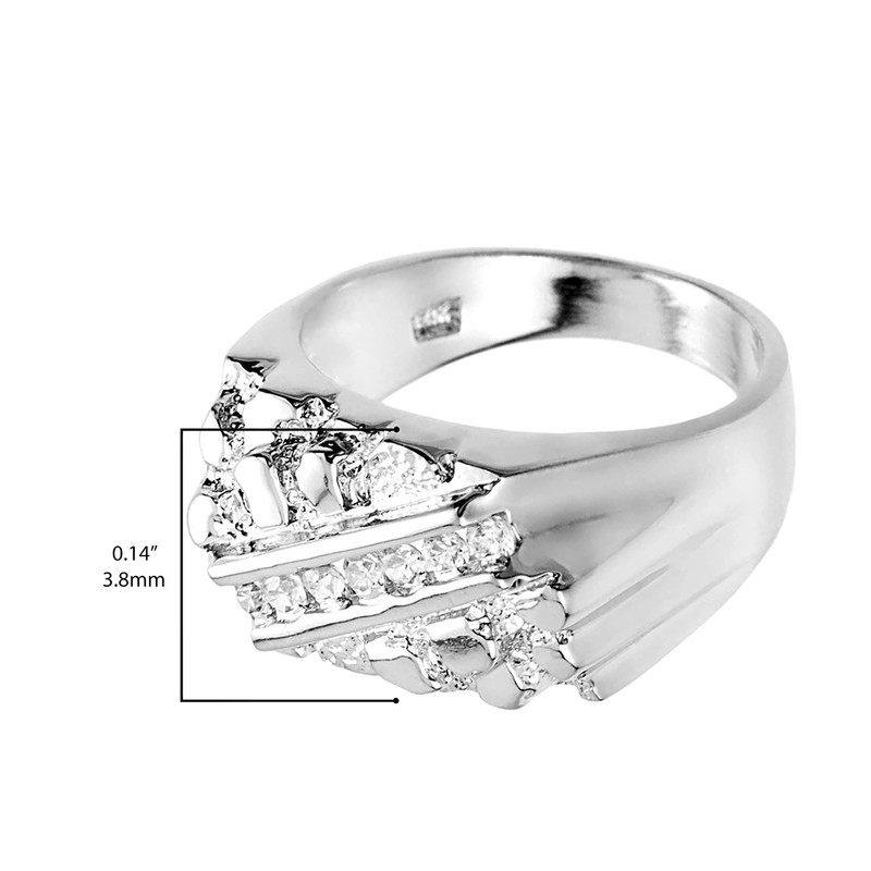 - RUGGED ELEGANCE - This fine solid 925 sterling silver statement ring features nugget style texture across its face interrupted by a raised diagonal channel with seven sparkly CZ gemstones. The ring has a shiny tapered band. The ring is available in a wide variety of sizes making it a fantastic choice for either a fashion band or pinky ring. This uniquely textured nugget style ring is sure to invite compliments and spark conversations. It makes a great gift for a father, brother, friend, or love.