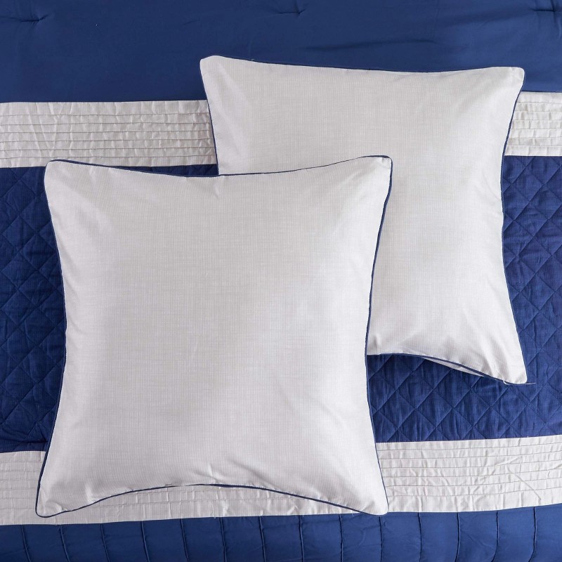 Logan is a “mixed media” bedding set; mixing many different techniques in one. This set is pieced, pleated and quilted. The soft yarn dye print on the back offers a reversible option for your room. This print is also pieced in to the top of the bed and pleated for a tailored appearance. The euro shams match the yarn dye print, coordinating the set handsomely.