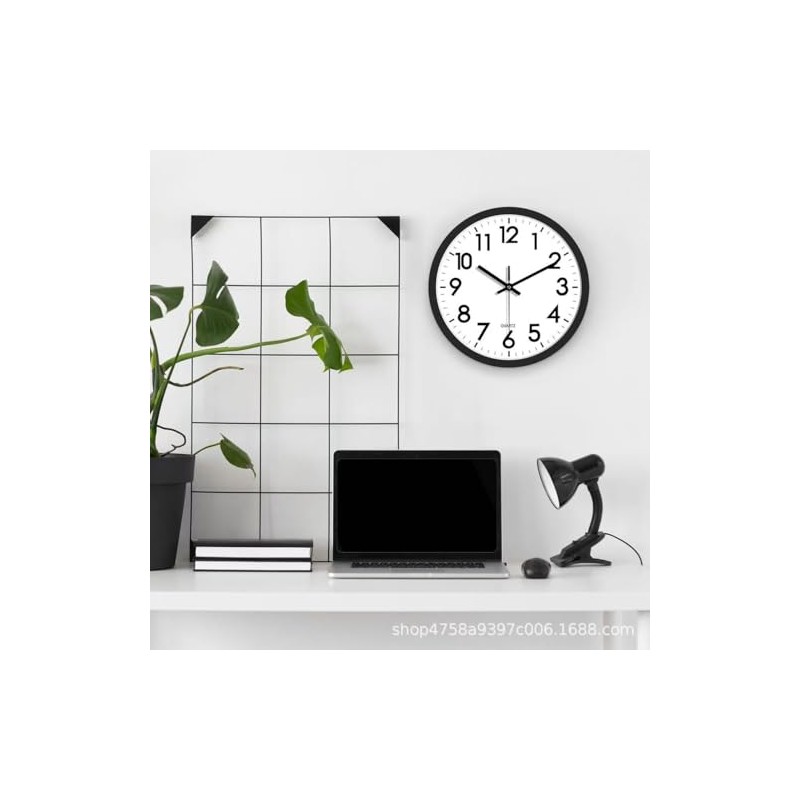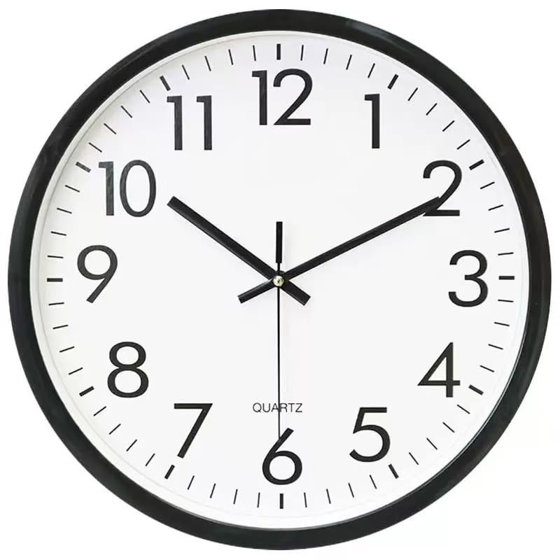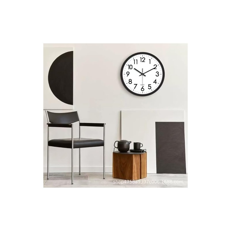 Elevate your space with this sleek and functional 12-inch wall clock, featuring a classic black frame that perfectly complements its crisp white face. The large, bold numbers ensure excellent readability from across the room, while the precise quartz movement keeps accurate time. This clock's silent operation means no distracting ticking sounds, making it perfect for offices, classrooms, bedrooms, or any quiet space where peace is paramount. The clean, minimalist design works harmoniously with any decor style, from modern to traditional. The clock runs on standard carbon-core batteries (not included) and comes with easy mounting hardware. Its durable construction and quality components ensure reliable timekeeping, while the contrast between the black hands and white face provides optimal visibility. Whether you're managing your schedule at home or maintaining punctuality in a professional setting, this wall clock combines practicality with sophisticated style. The clear minute markers and sweeping second hand allow for precise time reading, essential for keeping your day on track.