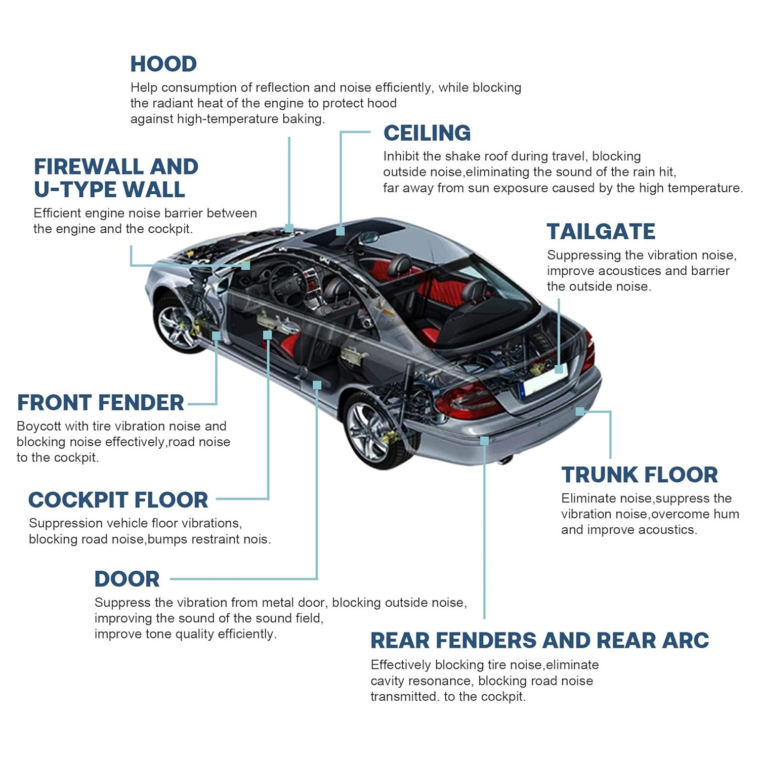 You can also use on car roof floors, hood , firewall, chassis, trunk room, trunk lid and so on. Do not cover the chassis wiring or air holes.