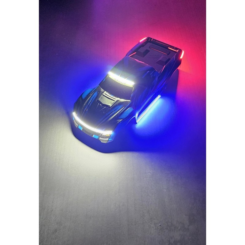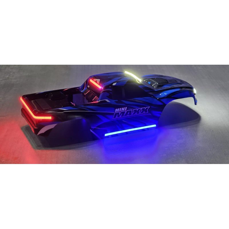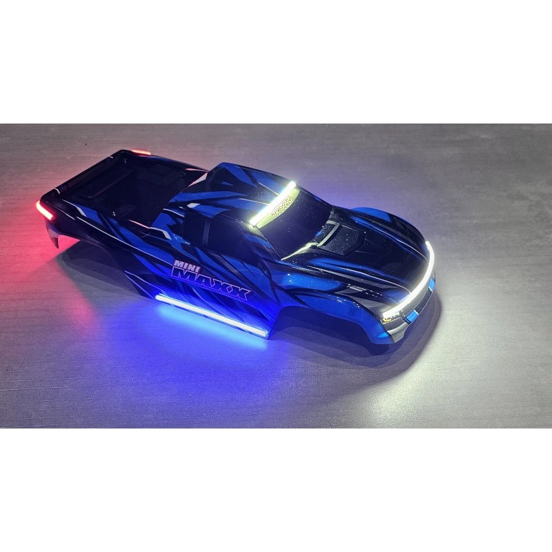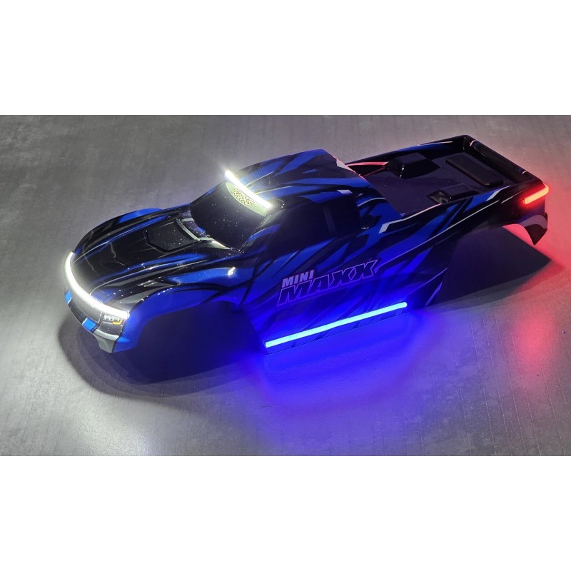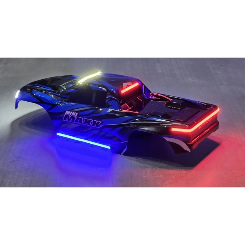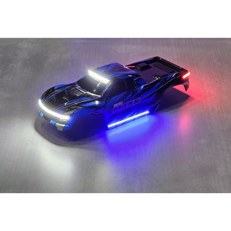 Made specifically for the TRAXXAS MINI MAXX model. The light system consists of the following: 48 nano super bright daylight LEDs with no dead spot running through out the entire front as the head light strip, 20 daylight white LEDs as the roof bar light, 48 super cool (ground effects) light strips on each side of the body as underglow lightstrips, 24 nano leds as the third brake light, and one super long red tail light strip consists of 72 nano LEDs covering the entire rear end plus both side portion rear fenders. This light kit will definitely be the brightest and coolest you will ever see in an rc car body of this size. This LED light is also compatible with a range of scales, including 1:10, 1:12, 1:14, 1:16, 1:18, etc.