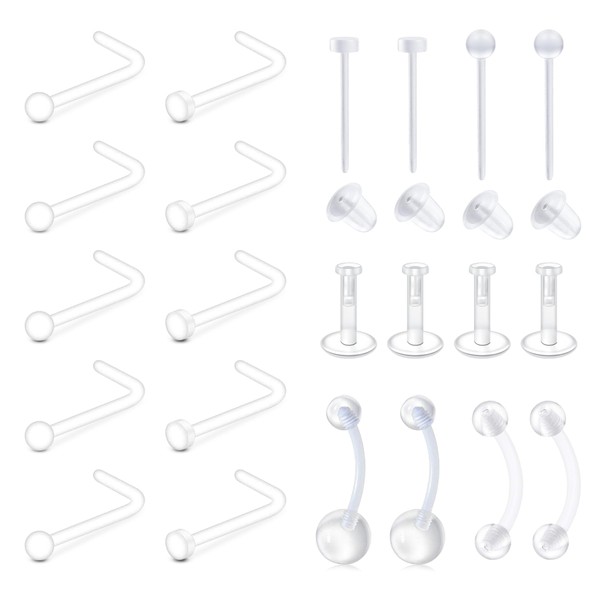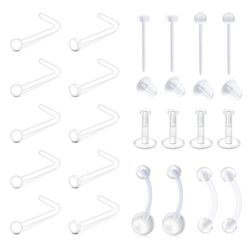 - [Item Contain]: 5pcs clear nose studs flat top + 5pcs clear nose rings round top + 2 pairs clear earrings + 4pcs clear cartilage earring + 2pcs plastic belly button ring + 2pcs clear rook earrings