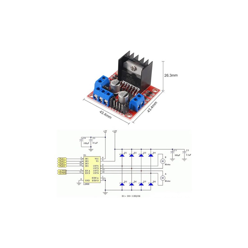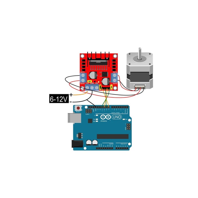 Tarjeta para el control de motores de corriente directa, motores a pasos, solenoides y en general cualquier otra carga inductiva. La tarjeta esta construida en torno al circuito integrado L298N, el cual dispone en su interior de 2 puentes H independientes. La tarjeta expone las conexiones hacia el motor a través de bloques de terminales atornillables, mientras que las entradas de control y habilitación del puente H se exponen a través de headers macho estandar para facilitar todas las conexiones