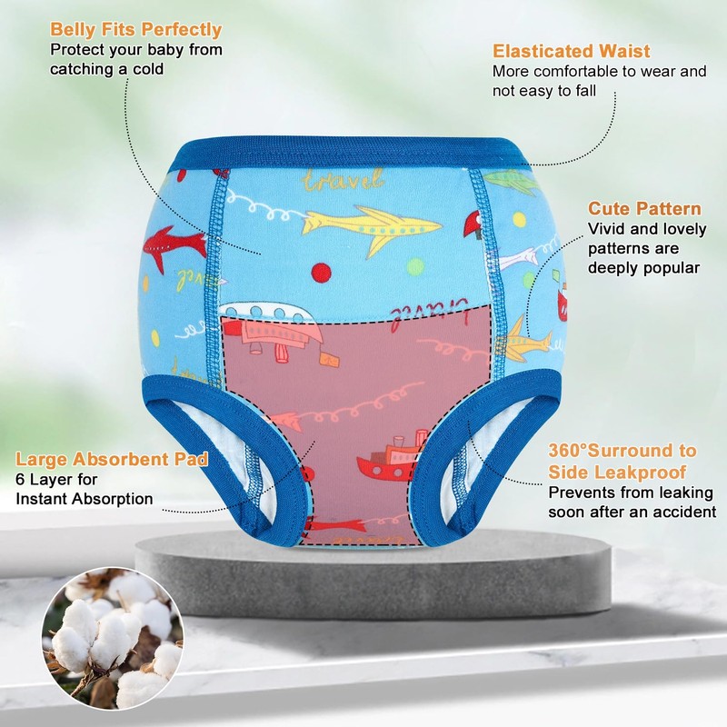 - 360° Fit Training Pants: Our potty training pants has an elasticated waist to keep pants from falling out, elasticated legs to prevent leaks, and a perfect fit around the tummy. Toilet Training Pants are comfortable to wear and help babies to get better at potty training