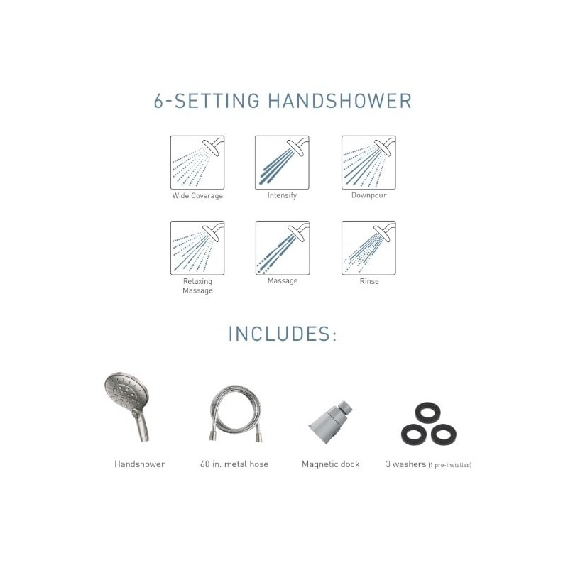 Inspired by patterns found in nature, the Moen Engage Magnetix Showerhead offers a distinctive design that is at home in any decor. The Spot Resist Brushed Nickel finish bring a warm appeal to your bathroom.The large, 5.5-inch diameter removable spray head provides maximum water coverage. Customize your shower at the push of a button by clicking through 6 optimized settings. Magnetix docking allows for easy release and return with the magnetic docking system, even with your eyes closed. This showerhead always docks facing forward to avoid exterior splashing outside your shower. Includes a kink-free metal hose that extends reach and flexibility.