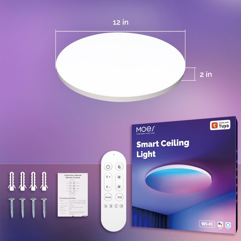 MOES Smart LED Ceiling Light, 2500LM WiFi Flush Mount, Color Changing Ambient Light Fixture, 3000K-6500K CW & RGB Dimmable, Smart Life App Remote Control, Compatible with Alexa/Google Home, 12 Inch