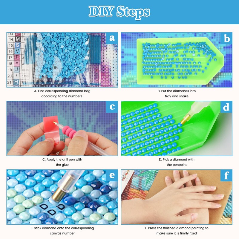- 【EASY TO USE】 DIY diamond painting is very interesting. Firstly place the same diamonds in tray, then take the "pen" insert to the square adhesive lightly, leave some adhesive on the pen, finally pick up the diamond and place it on the corresponding number on the canvas.Enjoy the fun of making handmade with your family.