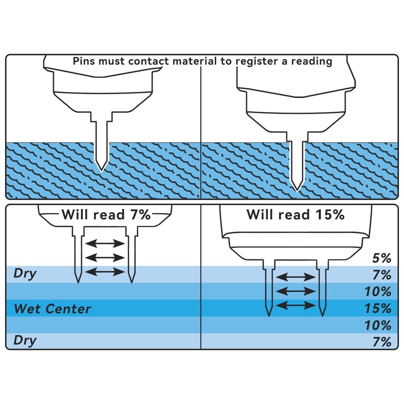 - Accurate Deep Moisture Measurement: For the most reliable readings, insert the pins deeply into the material (whether wood, hardwood, or building materials). The pins measure moisture along their entire length, allowing for precise readings—even when the surface is dry, but the interior is still moist