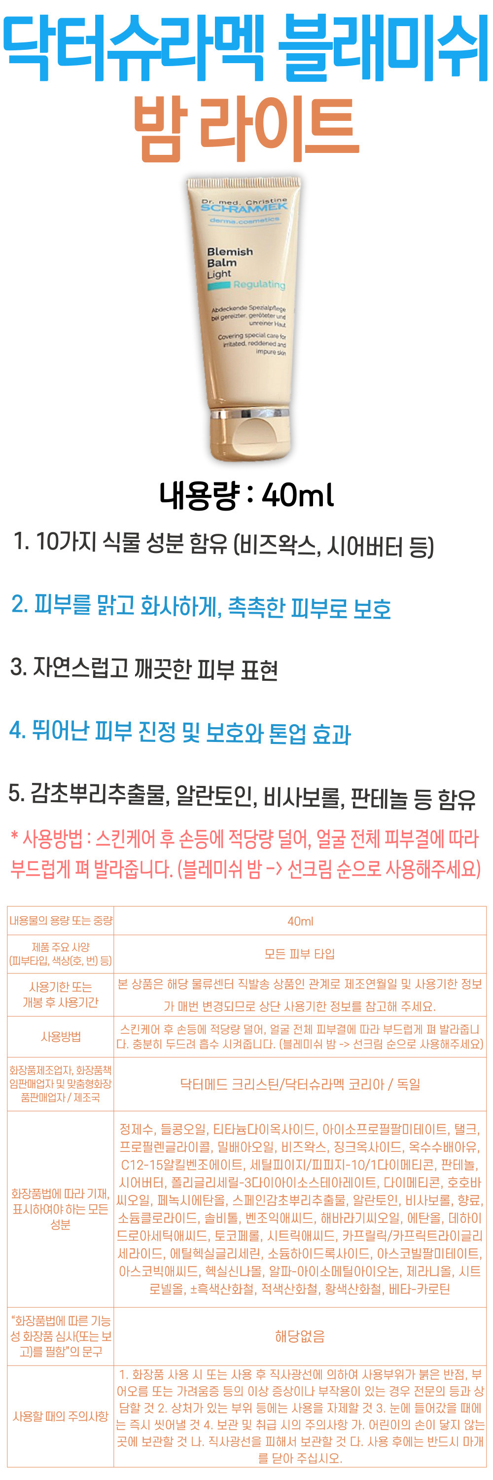 보습 기초 비비크림 닥터슈라멕 블레미쉬 밤 라이트 커버 크림 피부 진정 보호 기초 수분 보충 메이크업 베