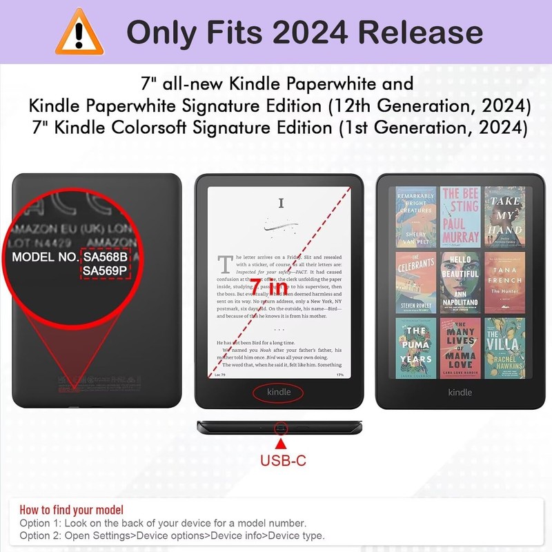 - Compatibility: Fits Amazon 7 inch Amazon All-New Kindle Paperwhite & Kindle Paperwhite Signature Edition (12th Generation 2024 Release) & Kindle Colorsoft Signature Edition (1st Generation 2024 Release). Model No. SA569B SA569P