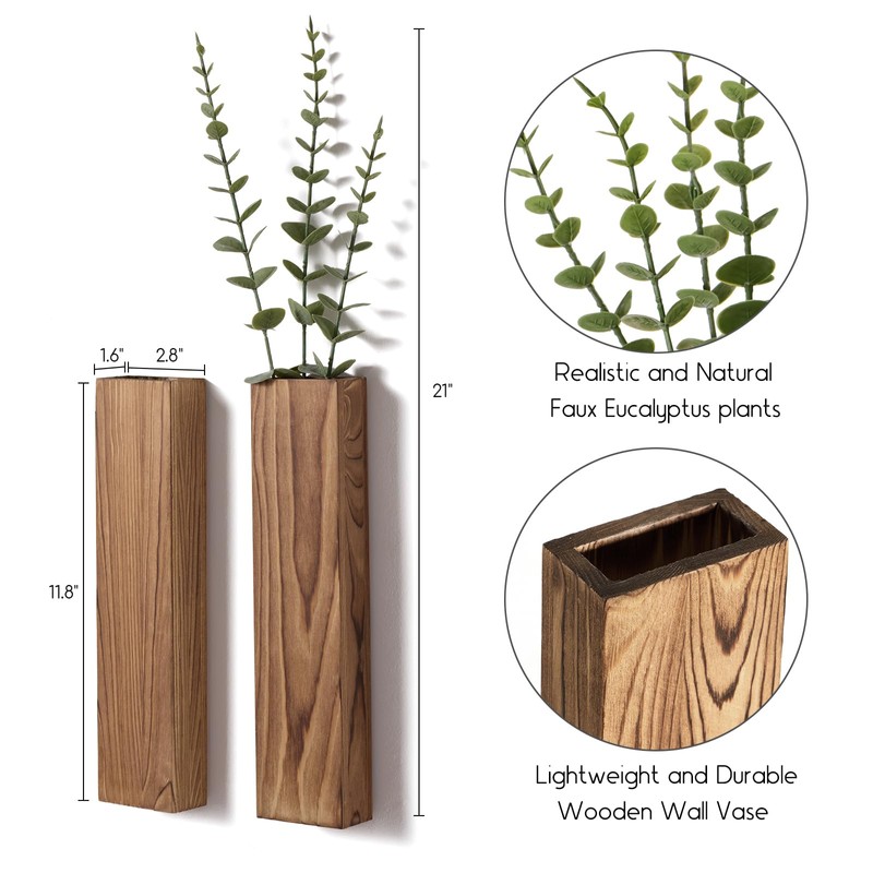 - 【Durable Materials & Maintenance Free】Crafted from pinewood and realistic eucalyptus stems require no watering, pruning or sunlight. The lightweight wall art feature a walnut finish, wood grain and add rustic charm, great for farmhouse, modern, Boho or vintage styles