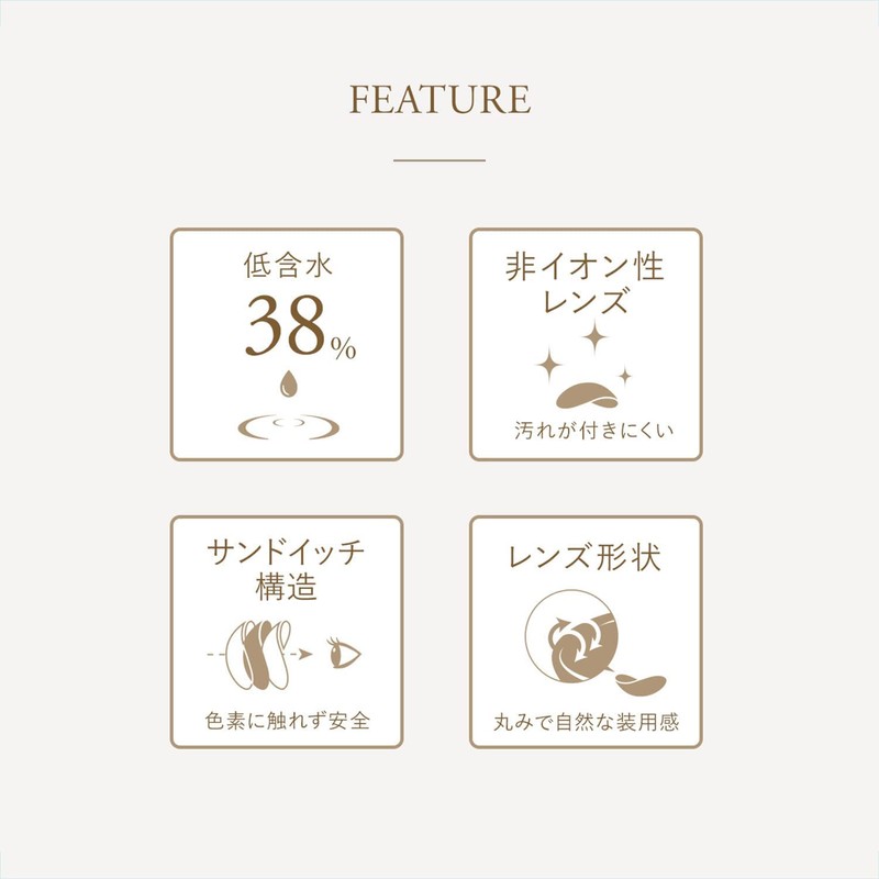 - [LENS FEATURE]・低含水で長時間装用やドライアイの方にもおすすめ ・非イオン性で汚れにくく長時間の装用でも視界をクリアに ・色素が直接目に触れない色素内包の構造 ・フチに丸みをもたせる形状で自然な装用感を実現