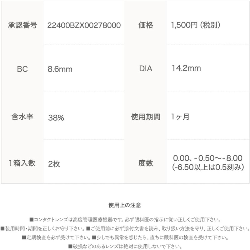 - [1箱入数]2枚 [BC]8.6mm [使用期間]1か月 [含水率]38% [DIA]14.2mm [承認番号]22400BZX00278000