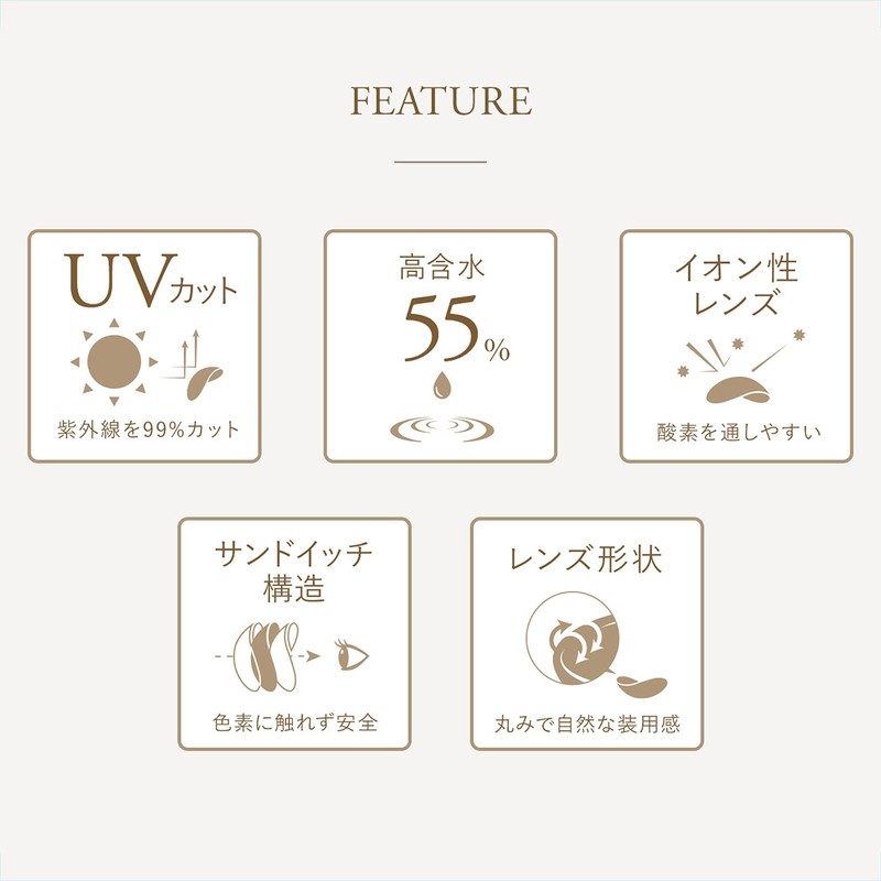 - [LENS FEATURE]・水分が多く含むやわらかい素材&瞳への負担が少ない快適な装用感 ・紫外線から瞳を守るUVカット ・色素が直接目に触れない色素内包の構造 ・フチを丸みのある形状にすることで自然な装用感を実現