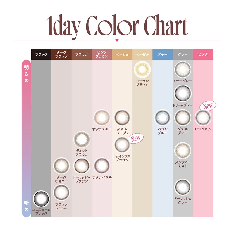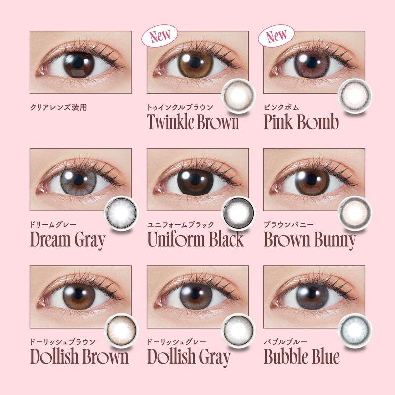 - [LENS FEATURE]・【UVカット】肌や瞳に有害といわれ、白内障などの眼病を引き起こす危険性のある紫外線をカットします ※UV-A波50%以上、UV-B波95%以上カット・【イオン性】脂質汚れが付きにくく、快適な装用感です。・【レンズ形状】フチを丸みのある形状にすることで自然な装用感を実現しました。・【高含水】水分を多く含む柔らかい素材で、瞳に違和感なく快適な着け心地です。 ※装用感には個人差があります。・【サンドイッチ構造】色素が直接瞳とまぶたに触れることがないレンズ構造を採用しています。