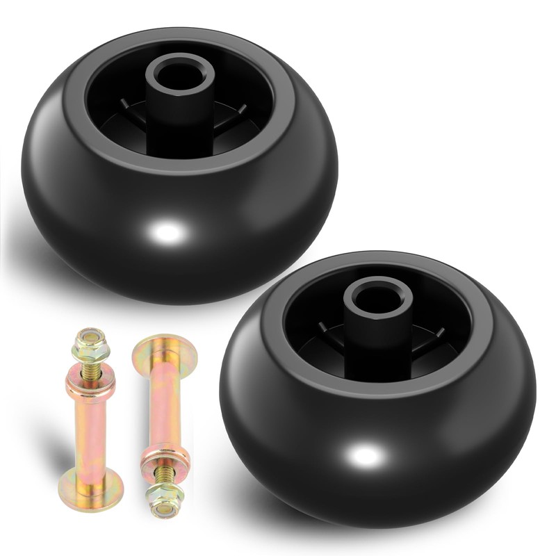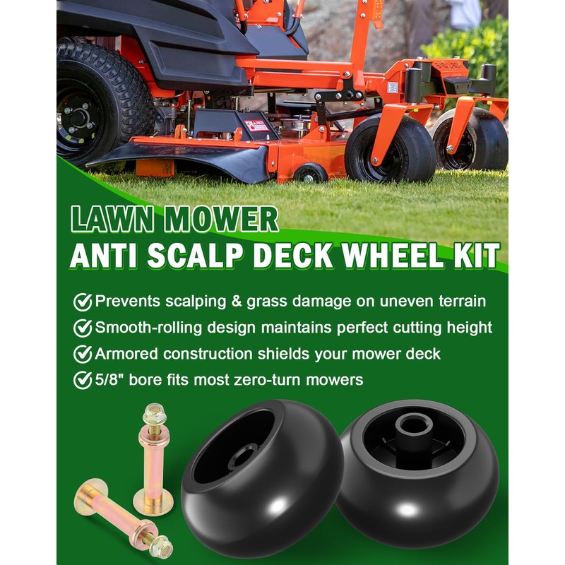 - COMPLETE HARDWARE KIT INCLUDED: Package includes two anti scalp deck wheels with a 5 inch diameter, 5/8 inch bore, 2.67 inch height, 2.5 inch hub. Also comes with two bolts, two bolt bushings, four metal gaskets in two styles, and two lock nuts for convenient installation