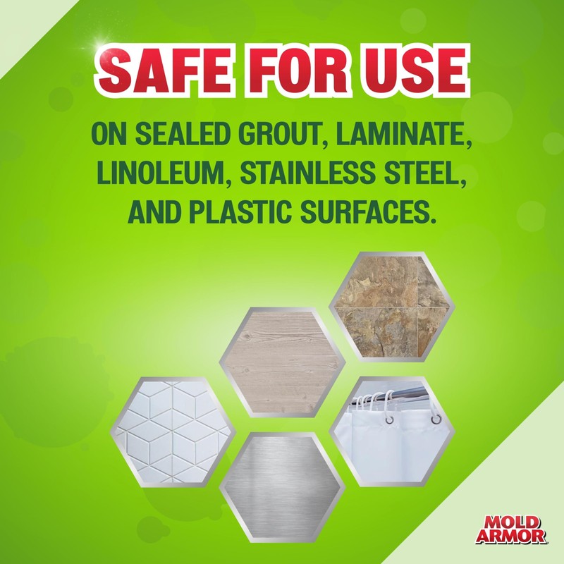Kill, clean, and prevent the return of mold and mildew on your hard, non-porous surfaces with MOLD ARMOR Professional Brand Mold Kill & Control. Packaged in a convenient trigger spray bottle, this mold control spray features a powerful, fast-acting formula that produces visible results in minutes without scrubbing and prevents the mold from coming back. It also eliminates bacteria and viruses, making it an ideal choice for high-touch surfaces in your bathroom, bedroom, basement, shower and more. Safe for use on laminate, linoleum, sealed grout and stainless steel. Test on an inconspicuous area before application. Ensure the area is well ventilated and apply mold killer spray directly to stains. Allow to sit for 10 minutes and rinse with water or wipe with a damp sponge before 15 minutes have elapsed. Store in original container in areas inaccessible to children. Keep securely closed. Dispose of usage waste on-site or at an approved waste disposal facility. Do not reuse or refill container. Discard in trash or recycle if available.