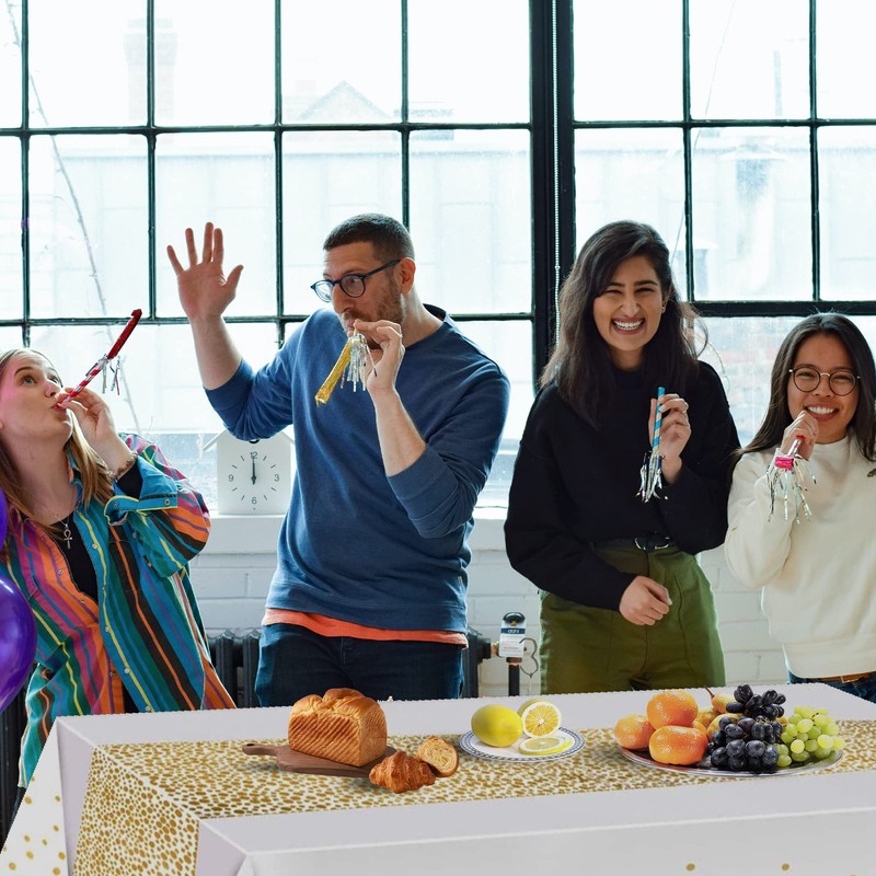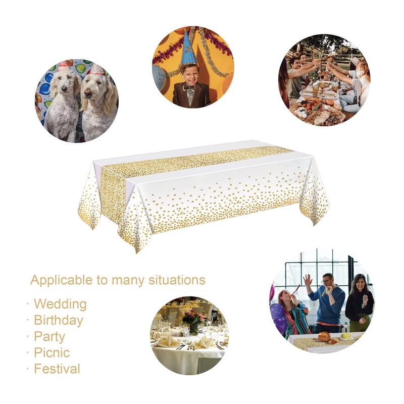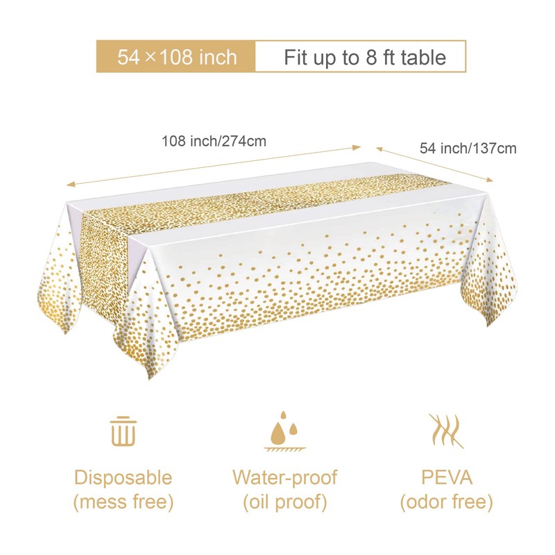 - [Material and Size] MOLFUJ white and gold table cloths for parties is made of high-quality PEVA plastic, 54x108 inch (137x274cm) suitable for 6-8 foot rectangular tables.
