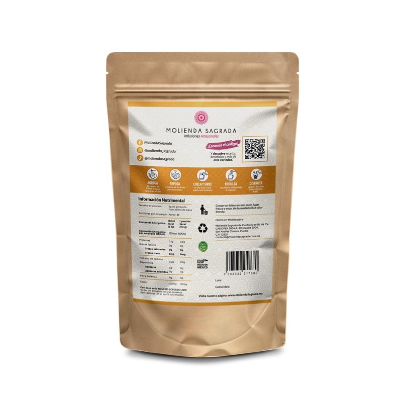 - INSTRUCCIONES DE PREPARACIÓN SUGERIDAS: Usar 3 gr para una taza de 250 ml, preparar la infusión en agua caliente recomendada a una temperatura de 90°C durante 5 minutos aporx.