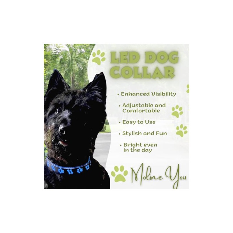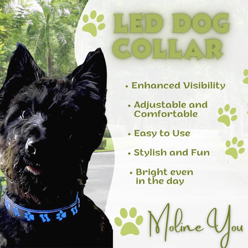 - IDEAL FOR YOUR TRAVEL AND ADVENTURES: Whether you're hiking, camping, or just taking a walk around the neighborhood, with Moline You rest assured that your dog will be easily identified with our high visibility light up collar. It is lightweight and comfortable for dogs to wear all day.