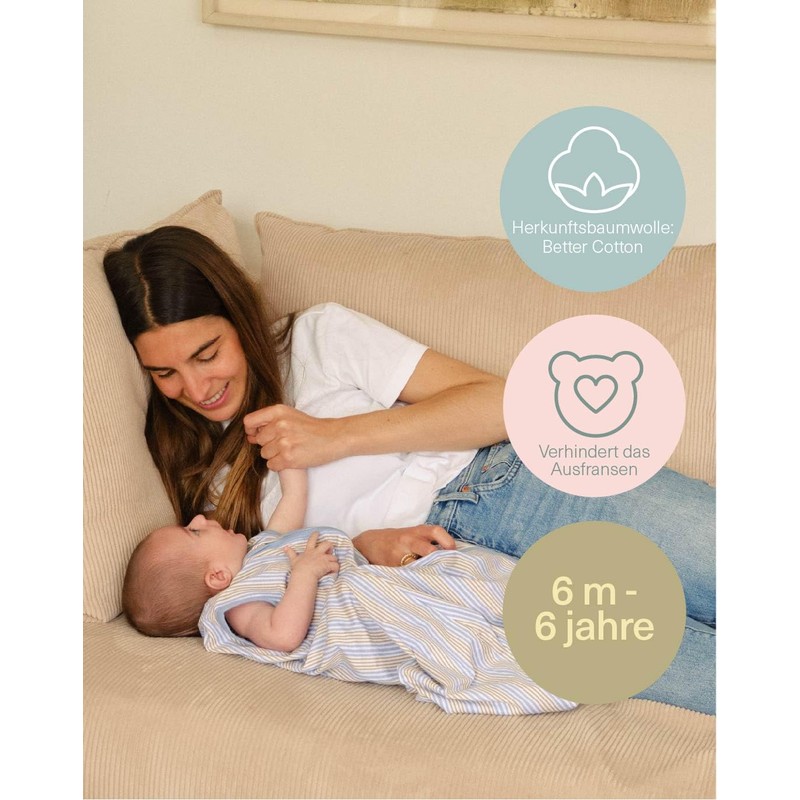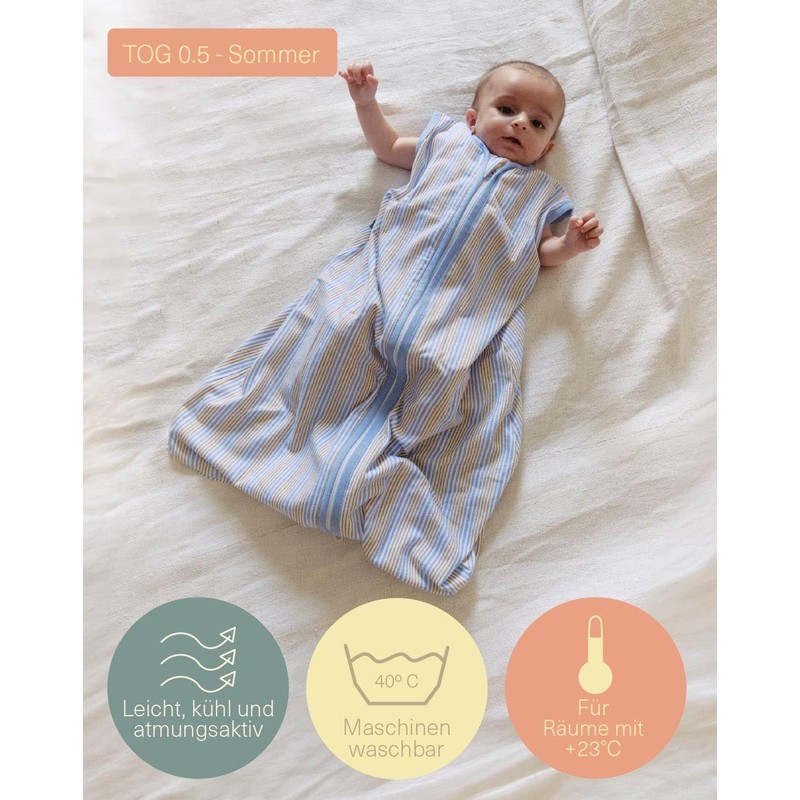 - Lightweight and cool: the tog measures the warmth of the baby sleeping bag according to the room temperature and ensures the comfort of your baby. For summer, choose TOG 0.4 or 0.5 for temperatures above 23 degrees. Our super breathable and cool fabric prevents excessive sweating and promotes better sleep. How to put it on? Use a short sleeve bodysuit or pyjamas under the sleeping bag. In high heat, the sleeping bag can be worn directly on the skin thanks to its softness.