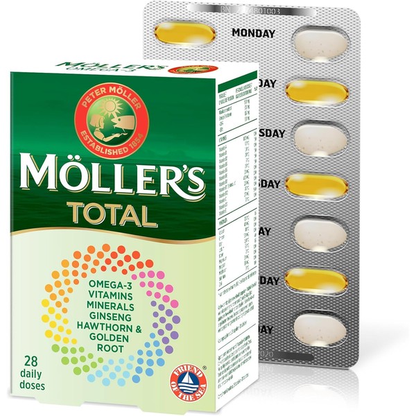Moller’s ® | Möller's Total | Complete Daily Supplement | Nordic Omega-3 Dietary Supplement with EPA and DHA | Broad Spectrum of Vitamins and Minerals | Ginseng, Hawthorn & Golden Root | 56 Capsules
