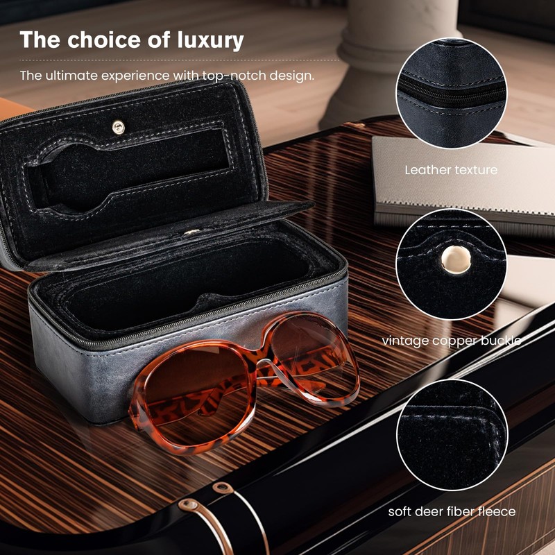 - MATERIAL: The outside of this watch sunglasses case is made of smooth leather with a cross grain texture on the outside. The storage box feels delicate and is easy to clean. The inside is made of suede material, which is soft, smooth and thin and feels good. The elegant workmanship and high-quality materials protect your accessories from dust.