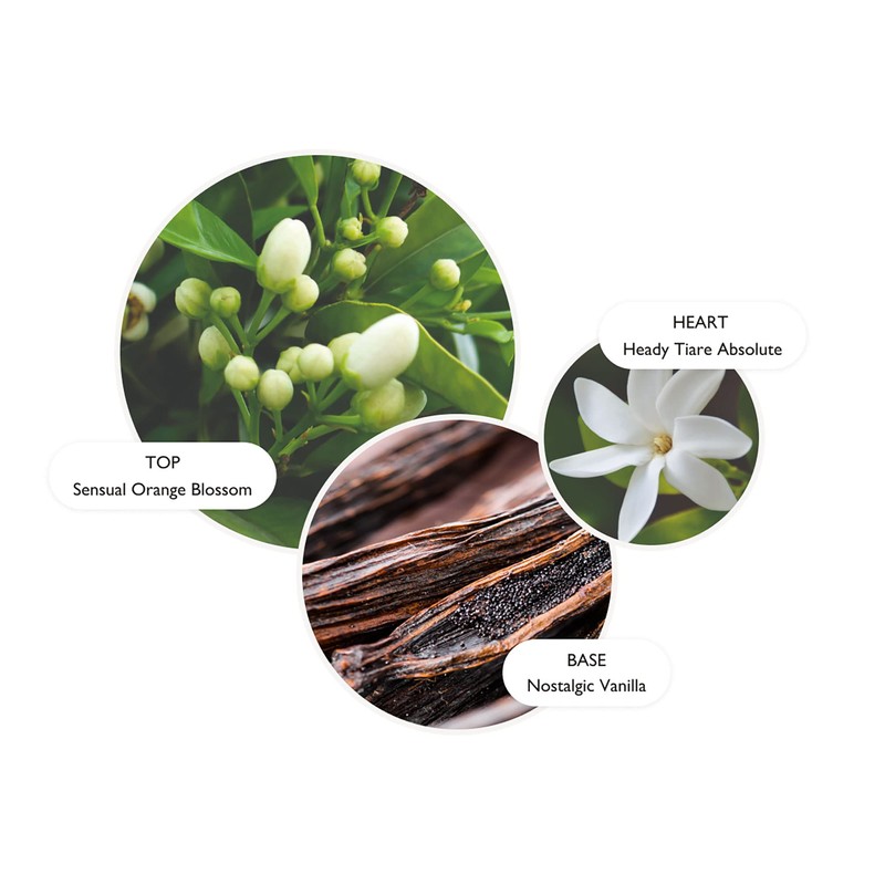 - Top notes of orange blossom, mandarin and ylang-ylang. Middle notes of Polynesian frangipani, jasmine absolute and rose absolue. Base notes of vanilla, cedar and musk