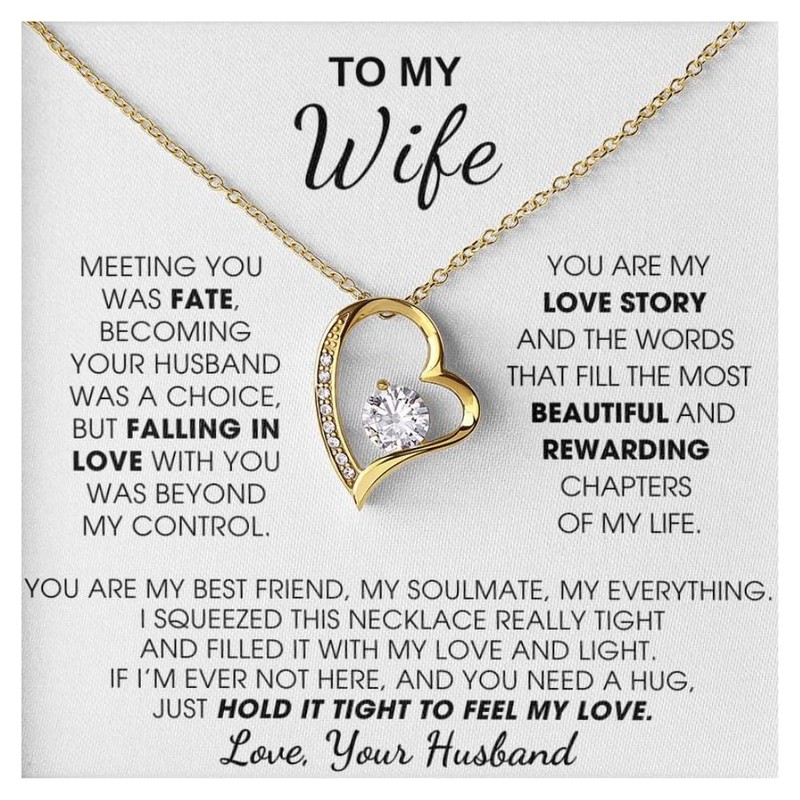 - Quote On Card: “TO MY WIFE, MEETING YOU WAS FATE, BECOMING YOUR FRIEND WAS A CHOICE, BUT FALLING IN LOVE WITH YOU WAS BEYOND MY CONTROL. YOU ARE MY LOVE STORY AND THE WORDS THAT FILL THE MOST BEAUTIFUL AND REWARDING CHAPTERS OF MY LIFE. YOU ARE MY BEST FRIEND, MY SOULMATE, MY EVERYTHING. I SQUEEZED THIS NECKLACE REALLY TIGHT AND FILLED IT WITH MY LOVE AND LIGHT. IF I'M EVER NOT HERE, AND YOU NEED A HUG, JUST HOLD IT TIGHT TO FEEL MY LOVE. Love, Your Husband "