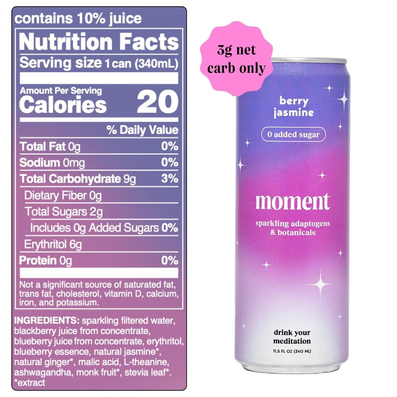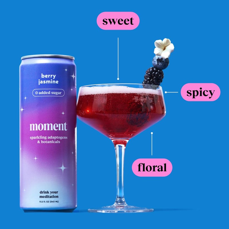 Moment Adaptogen Drink (Shark Tank) | Berry Jasmine Sparkling Soda | Flavored Sparkling Water | L-Theanine, Ashwagandha for Calm | Sugar Free Drinks, 0 Caffeine, 0 Alcohol | 12-pack
