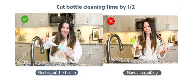 【Safely & durable】: Made from food-grade silicone, free of bpa components. The silicone brush heads are more durable than plastic or sponge alternatives, ensuring that this electric baby bottle brush will last a long time without needing replacement