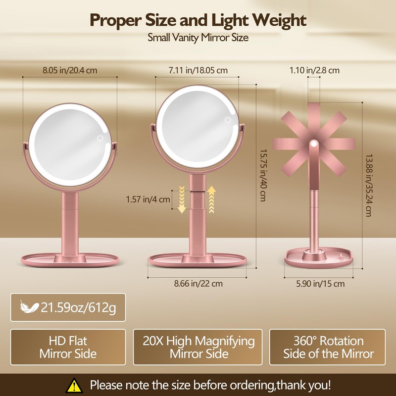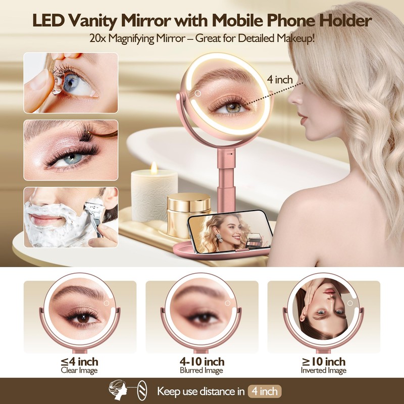 - Dual Side 1x/20x Magnifying Makeup Mirror with Adjustable Height: This magnifying makeup mirror features 1X for everyday makeup and 20X magnification for precision tasks: tweezing brows, inserting contacts, applying false lashes, and removing blackheads. Designed for versatility, it’s the go-to makeup mirror for young women, seniors, and even cataract patients—alleviating common makeup challenges with ease.