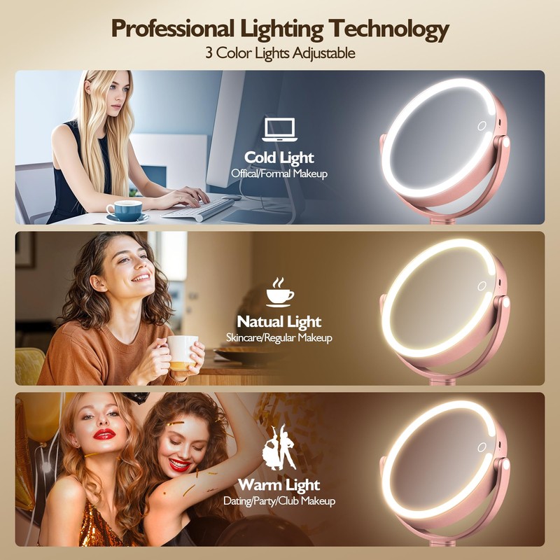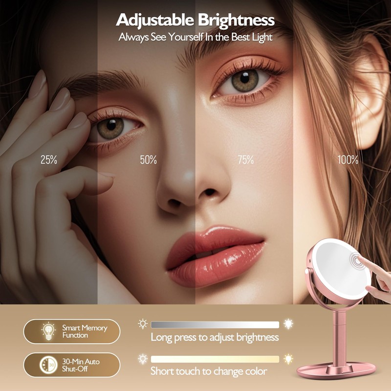 - 3 Colors & Brightness Adjustable: The lighted makeup mirror features 80 high-brightness eco-friendly LED beads for superior illumination.Touch switch gently to change the color light modes between cold, natural and warm light.Long press to adjust the brightness, meet all your needs in different environments.In addition, this light up makeup mirror has a 30-minute scheduled shutdown and memory function. it will remember the last brightness you used.
