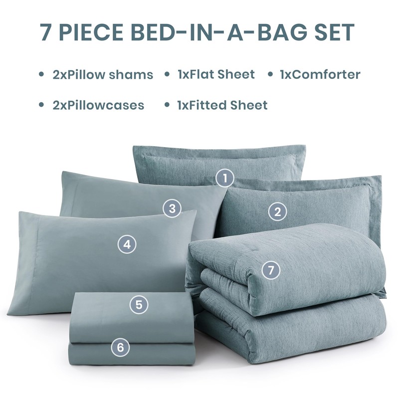 Monbix Queen Comforter Set - 7 Pieces Dusty Blue Cationic Dyeing Bed in a Bag Queen Bedding Sets with Sheets, Pillowcases & Shams, Reversible Bedding Comforters