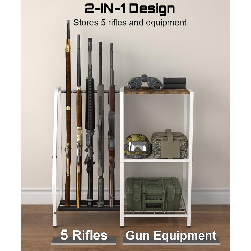 - 2-in-1 Storage Space: This versatile gun rack combines a 3-tier storage shelf with a gun display stand. The floor rifle stand for shooting vertically stores 5 rifles, featuring 4 adjustable rods to accommodate firearms of various sizes. The 3-tier shelving system organizes ammo boxes, helmets, binoculars, radios, gloves, and other gear, maximizing vertical space efficiency for diverse storage needs