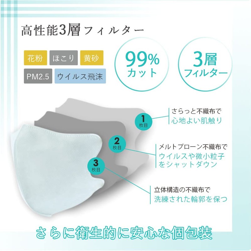 - ✅商品特徴:・さらりと快適息がしやすい ・高性能3層フィルターでしっかりブロック ・安心の品質検査済 ・つけ心地抜群の立体構造 ・耳ゴムと本体のカラーが異なるバイカラーマスク ・ソフトゴムで耳が痛くなりにくい ・衛生的な個包装 ・選べるカラーは全4色