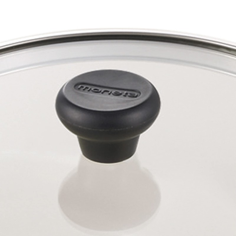 • Flat glass lid with stainless steel rim and knob made of athermic bakelite