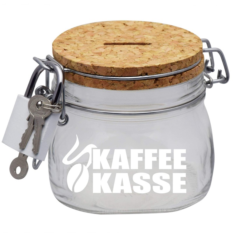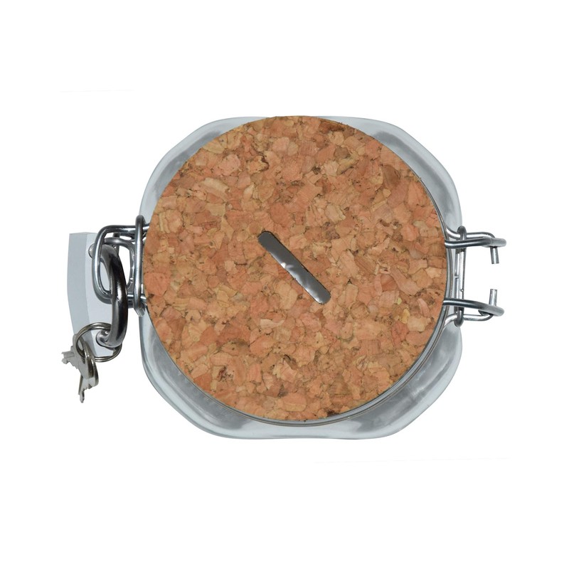 • Glass money box contents: 10 x 10 x 10 cm equivalent to 0.5 litre volume, cork lid with economy slot, padlock with 3 keys. With a money box to write on yourself, you will also receive a branded chalk. Lightly moisten the chalk for better labelling. Normal water is suitable for cleaning.