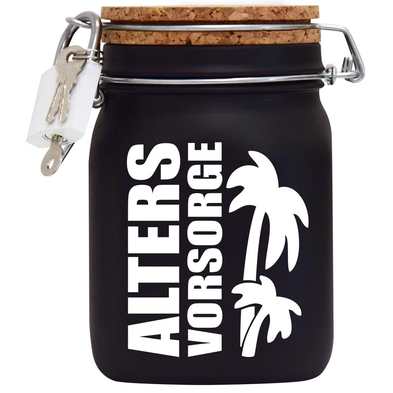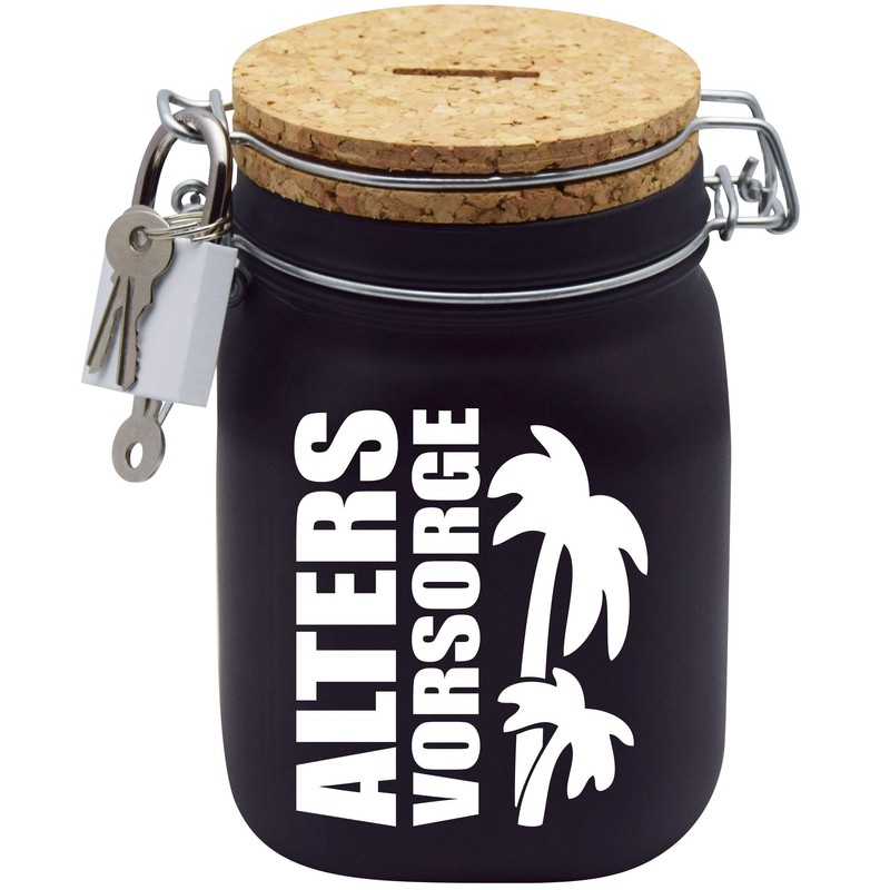 - Glass money box contents: 16 x 10 x 10 cm corresponds to 1 litre volume, cork lid with economy slot, padlock with 3 keys. With a money box to write on yourself, you will also receive a branded chalk. Lightly moisten the chalk for better labelling. Normal water is suitable for cleaning.