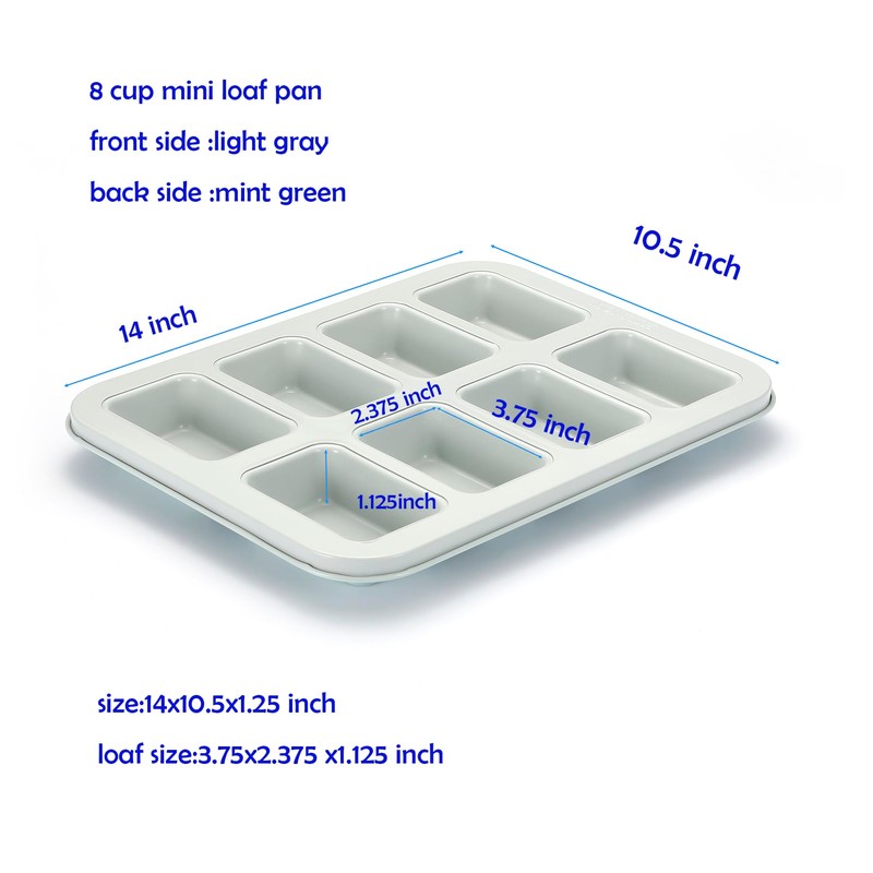 - Colorful Design :The non-stick coating of the mini 8 -cup loaf baking pan is light gray and the bottom is light green. The colorful design of the small rectangle cake tray adds more delight to your kitchen.