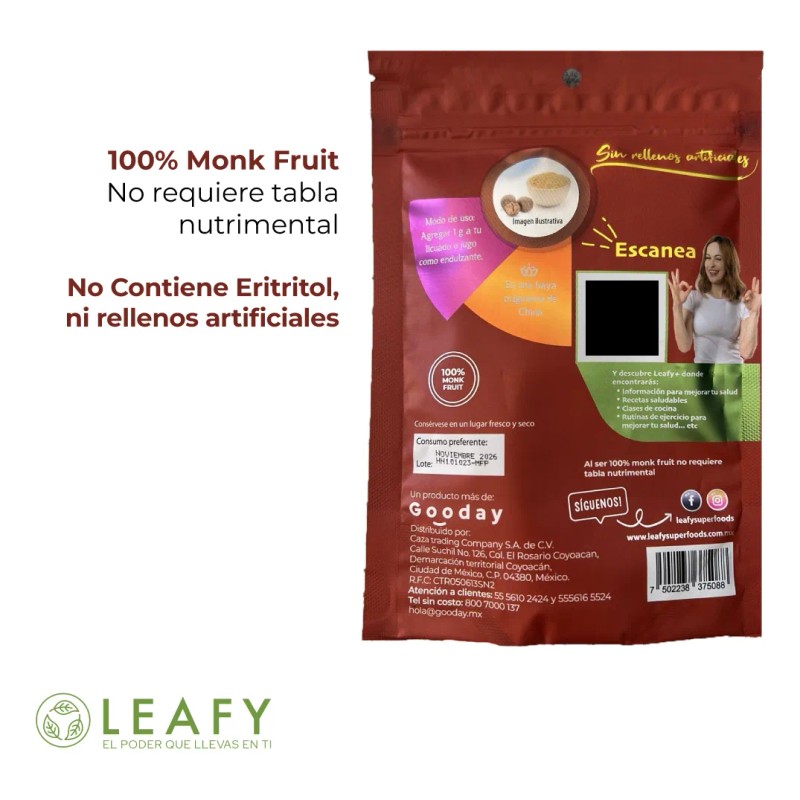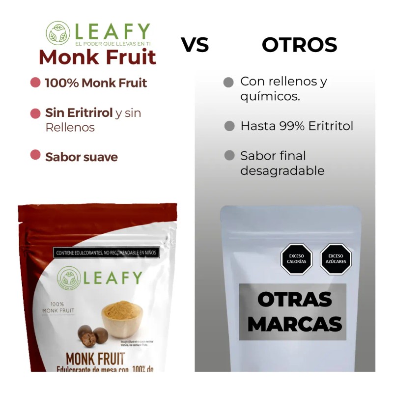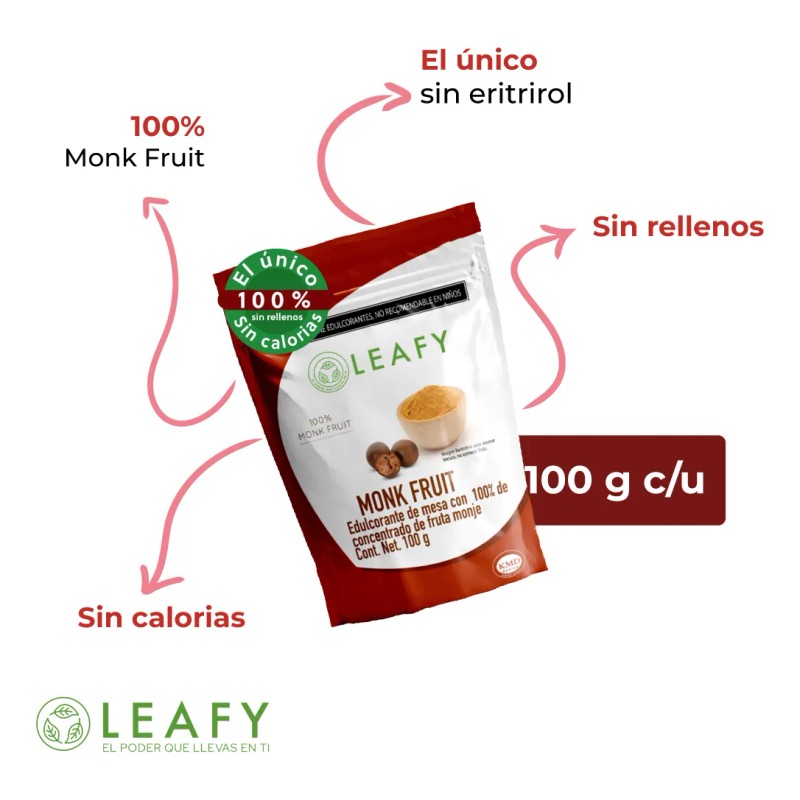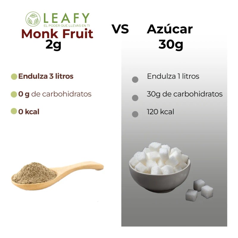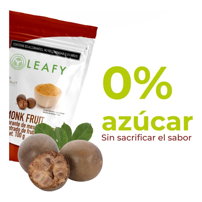 Disfruta del dulzor natural sin culpa con Monk Fruit Leafy, un endulzante 100% puro de fruto del monje, sin mezclas ni aditivos como eritritol. Perfecto para personas que siguen dietas keto, low carb, diabéticos o quienes buscan evitar el azúcar refinada. No eleva la glucosa en sangre y tiene 0 calorías, siendo ideal para cocinar, hornear o endulzar bebidas.