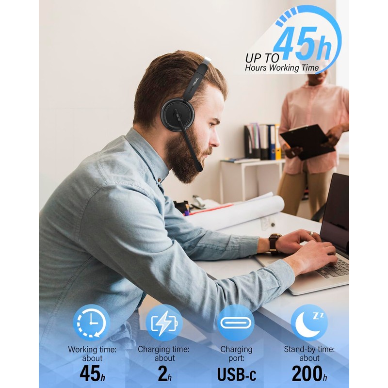 • MUTE SWITCH AND LONG BATTERY LIFE: The headset with microphone for work is designed with a dedicated mute button, granting you the freedom to easily mute your voice whenever you wish, creating a private meeting space. Moreover, the office headset boasts a large 400mAh battery, providing an impressive working time of up to 45 hours on a full charge (2 hours), making it an excellent choice for long-distance journeys or business use