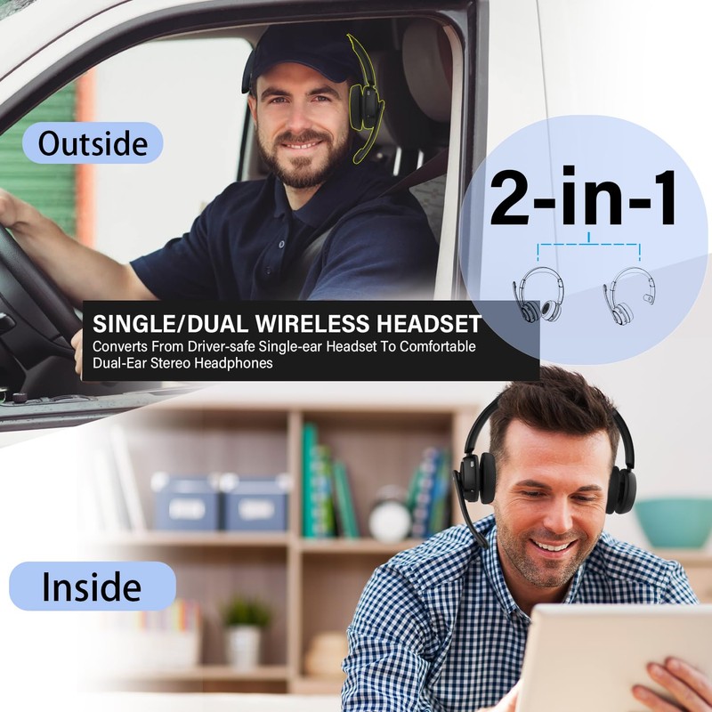 • DUAL/SINGLE HEADSET CONVERTIBLE DESIGN: One of the earcups on the computer headphones is removable, easily converting your wireless headset from a premium mono headset to stereo headset for immersive media experiences. And with the MFB button, you can effortlessly answer/hang up calls(Only for Mobile Phones). With its easy operation and practicality, this trucker headset ensures safe and hands-free driving communication