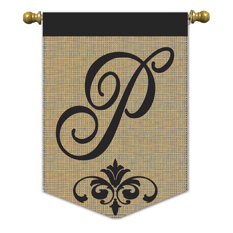 Monogram P Black Fleur de Lis 18 x 13 Pendant Shape Burlap Double Applique Small Garden Flag