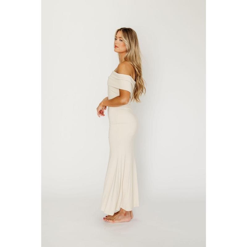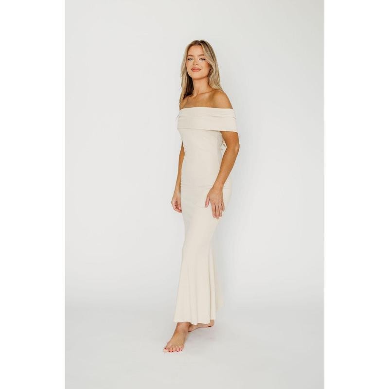 GARMENT DETAILS: Sleek and fitted maxi dress in a luxuriously soft premium knit. Features a folded off-the-shoulder neckline with short sleeves and a fit-and-flare design that is fitted through the hips and thighs and flares at the knee. Fully lined for maximum coverage and comfort.