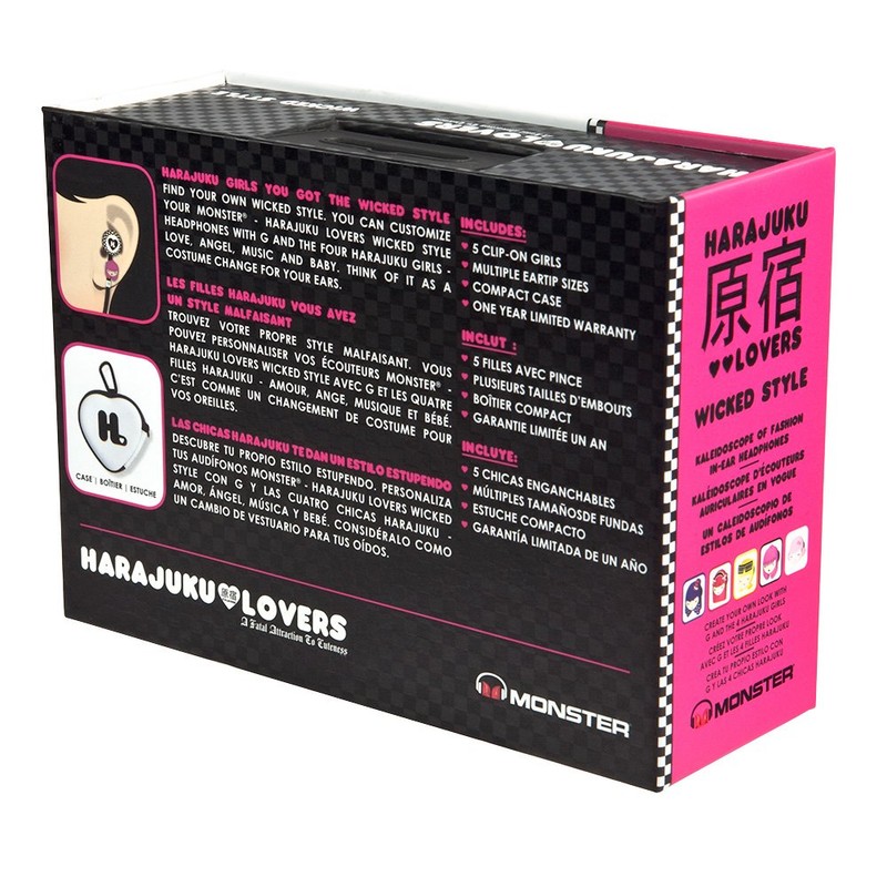 Harajuku Girls You Got the Wicked Style. Find your own wicked style. You can customize your Monster - Harajuku Lovers Wicked Style Headphones with G and the four Harajuku Girls -- Love, Angel, Music, and Baby. Think of it as a costume change for your ears. Monster Cable Harajuku Lovers Wicked Style. Ear coupling: Intraaural, Wearing style: In-ear, Driver type: dynamic. Connectivity technology: Wired, Connector contacts plating: Gold. Colour of product: Multicolour, Material: Plastic. Cables included: Audio (3.5mm), Package type: Box. Headphone connectivity: 3.5 mm