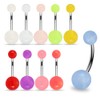 Product information: 316L surgical steel with UV acrylic balls that glow in the dark. Bar thickness: 14 gauge (1.6 mm), bar length: 8 mm to 12 mm. Ball size: 5 mm. Various colours. Pack of 10.
