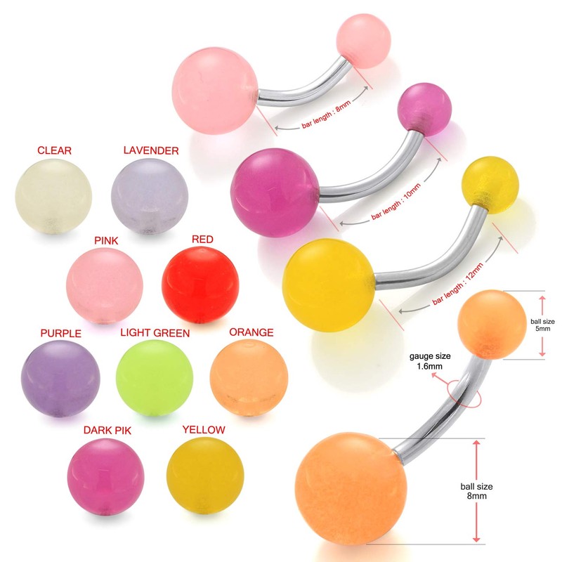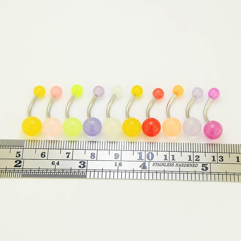 - Product information: material: 316L surgical steel with UV acrylic balls. This piercing is characterised by particularly high skin friendliness and a comfortable fit. Bar length: 10 mm. Bar thickness: 14 gauge (1.6 mm). Assorted colours. Glow in the dark Pack of 10. Hypoallergenic. Lead and nickel free.